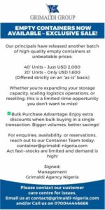 The Africa Association of Professional Freight Forwarders and Logistics of Nigeria (APFFLON) has issued a stern condemnation of Grimaldi Agency Nigeria for advertising the sale of empty containers in United States Dollars, describing the action as “a direct affront to Nigeria’s economic stability and a sabotage of the Federal Government’s Renewed Hope Agenda.”
